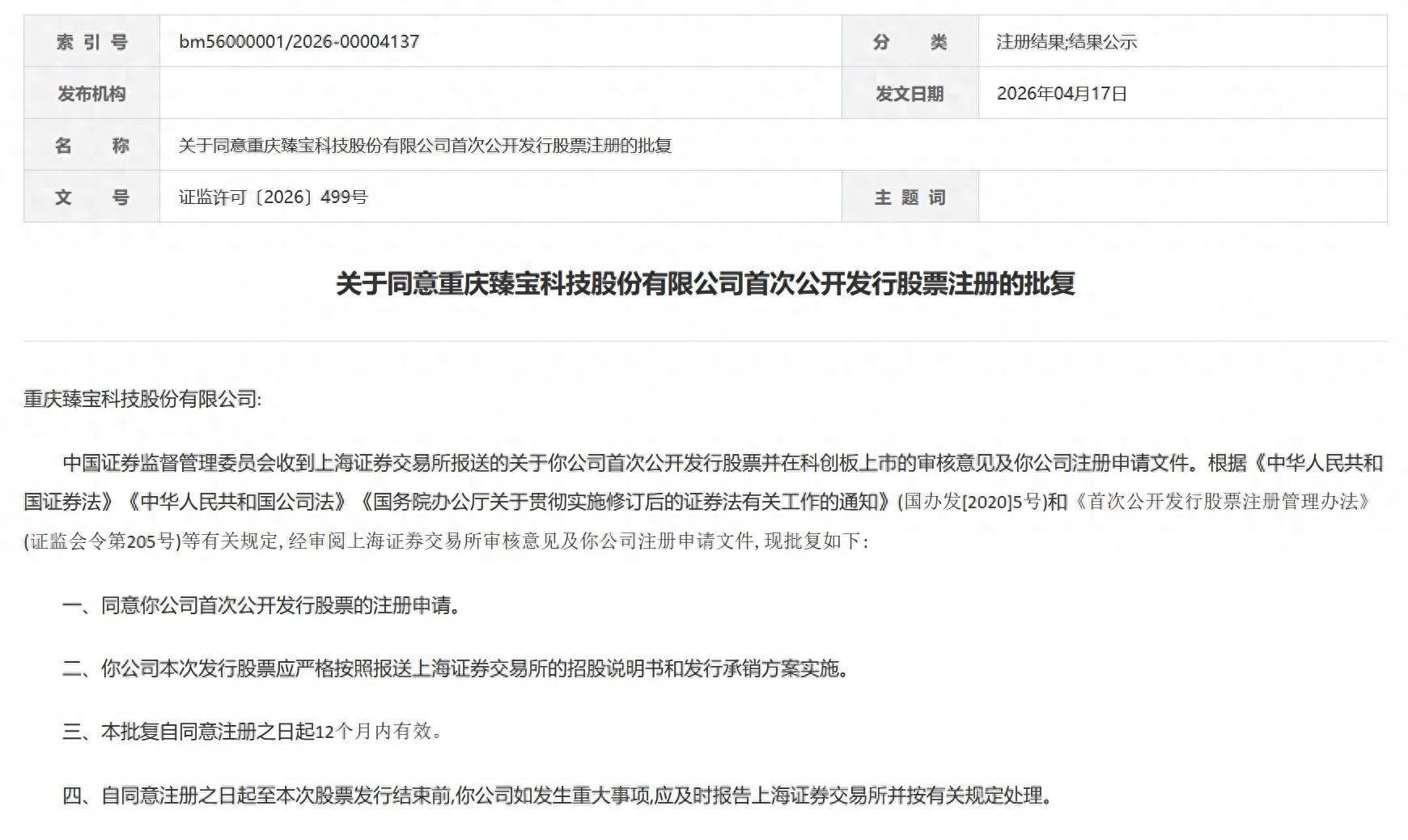智通财经APP获悉,4月17日,证监会发布《对于原意重庆臻宝科技股份有限公司初次公开荒行股票注册的批复》。据悉,臻宝科技拟在上交所科创板上市,中信证券为保荐机构,拟募资11.98亿元。