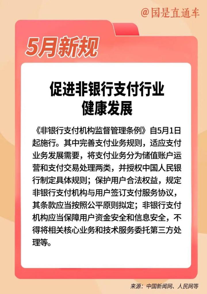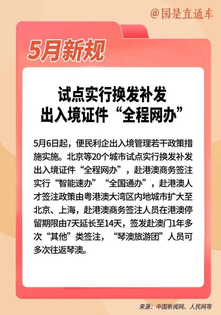 5月新规 试点实行换发补发进出境证件全程网办、对社会组织称号措置作出融合礼貌、促进非银行支付行业健康发展 5月有哪些新规和新计谋发扬现实?更多实质戳图了解...